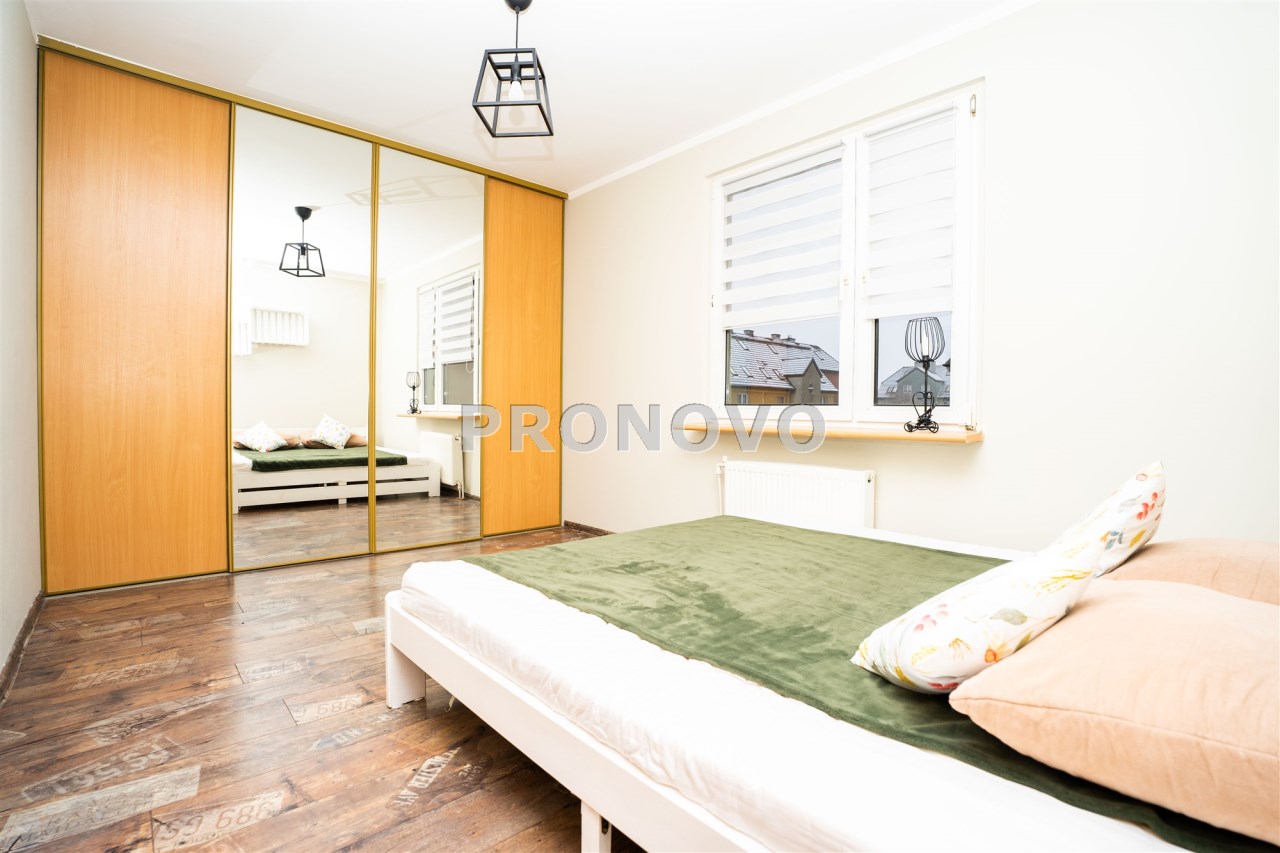 sypialnia wyposażona w łóżko o wymiarach 160 cm oraz pojemną szafę w zabudowie typu Komandor,