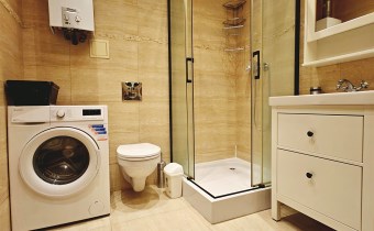 Wyposażenie łazienki umywalka na szafce, prysznic, pralka, lustro, WC