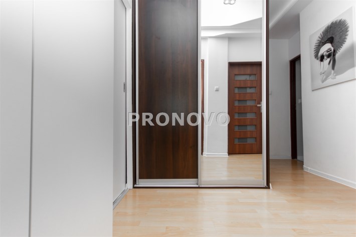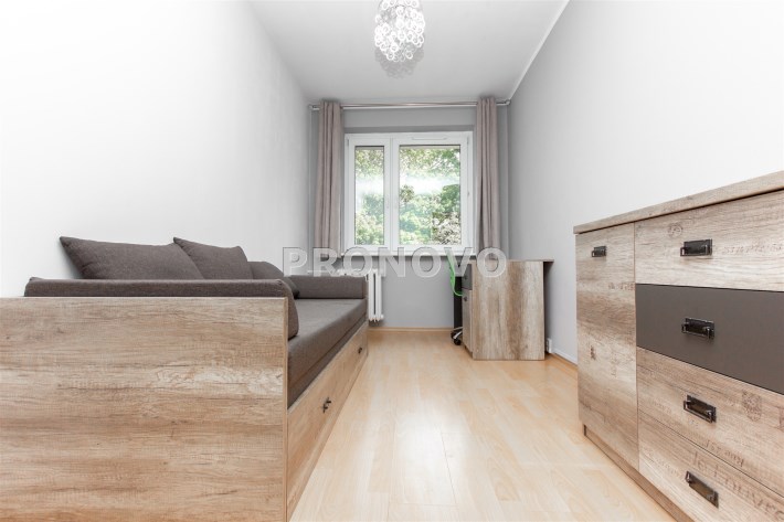 W mieszkaniu znajduje się łazienka z pralką oraz wanną, a także osobna toaleta. Do dyspozycji są również dwie duże szafy w zabudowie – jedna w holu, druga w przedpokoju – zapewniające dużo miejsca do przechowywania. Dodatkowym atutem jest przestronny balkon z widokiem na drzewa, który daje poczucie prywatności i spokoju.