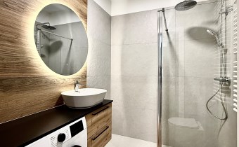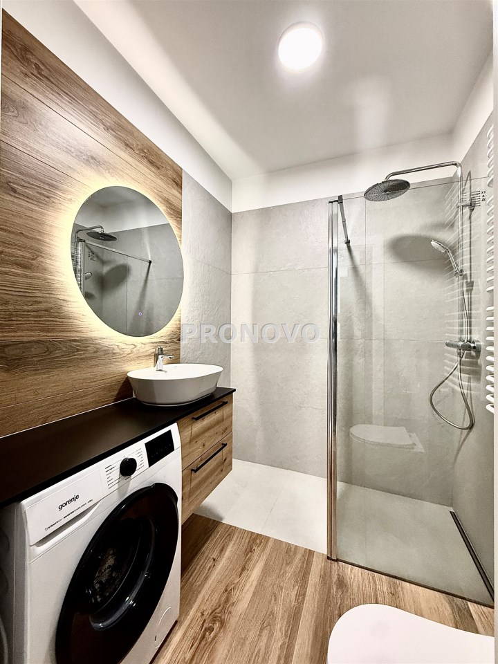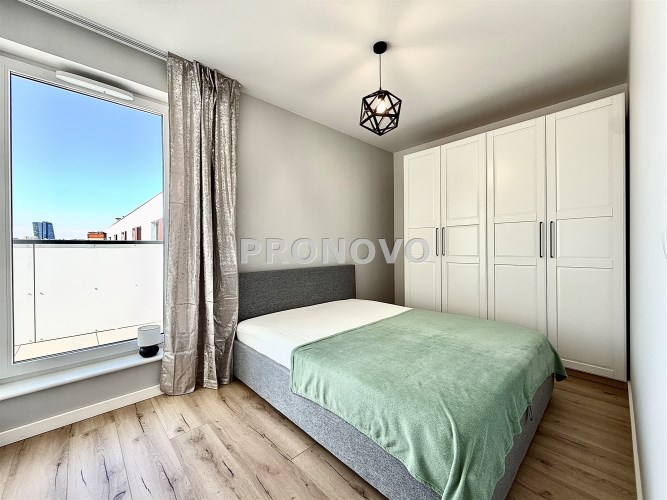 salon z aneksem kuchennym i wyjściem na duży balkon, a także dużą sypialnię. W łazience kabina prysznicowa typu walk in oraz nowa pralka. Dodatkowo po całej długości mieszkania ciągnie się duży
