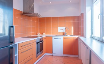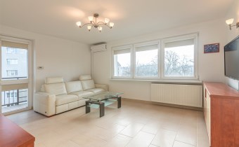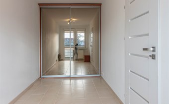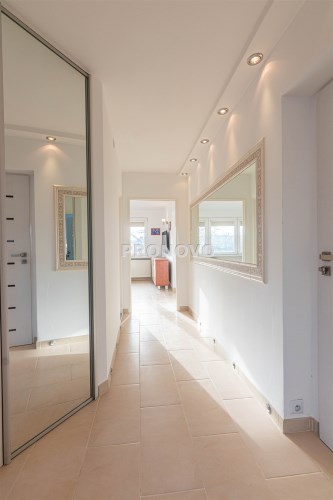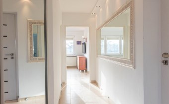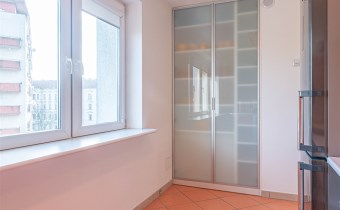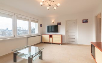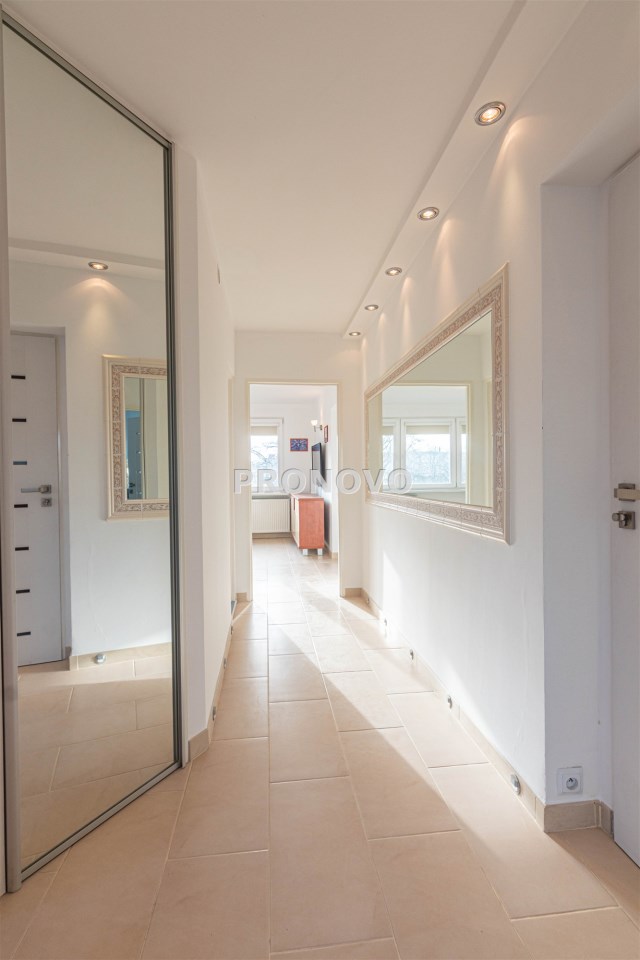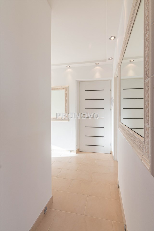 Mieszkanie w bardzo dobrym standardzie. Pokoje częściowo umeblowane, w pokoju dziennym wypoczynek skórzany, odbiornik TV, komody, w sypialni łóżko, stolik nocny, w drugiej sypialni szafa w zabudowie. W pokojach na podłodze terakota, ściany gładzone, malowane. Nowa stolarka drzwiowa, okna PCV, na oknach rolety przeciwsłoneczne. Kuchnia oddzielna, z oknem, umeblowana i wyposażona w sprzęt AGD: płyta elektryczna, piekarnik elektryczny, okap, zmywarka, duża lodówka z zamrażalnikiem, podświetlana szafa w zabudowie na drobny sprzęt AGD. Łazienka razem z wc, kabina prysznicowa, liczne szafki na bieliznę i ręczniki, łazienka wyposażona jest w pralkę. W przedpokoju szafa ubraniowa. Mieszkanie wyposażone w robota sprzątającego.