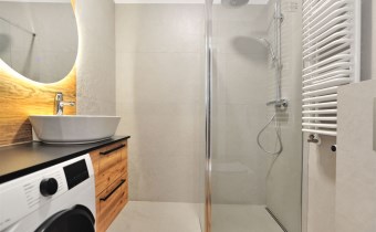 Wyposażenie łazienki lustro, pralka, prysznic, WC