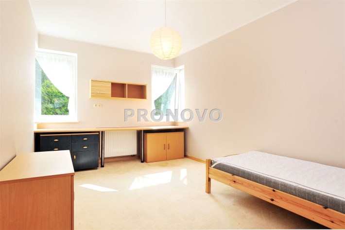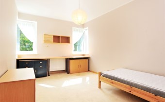 - Sypialnia (14m2) od strony wschodniej z dwoma oknami i widokiem na ogród przynależny do mieszkania. Pokój idealny dla 2 dzieci. Na podłodze wykładzina podłogowa. Łóżko 200x80. Szafki. Dużo biurko dla 2 osób.