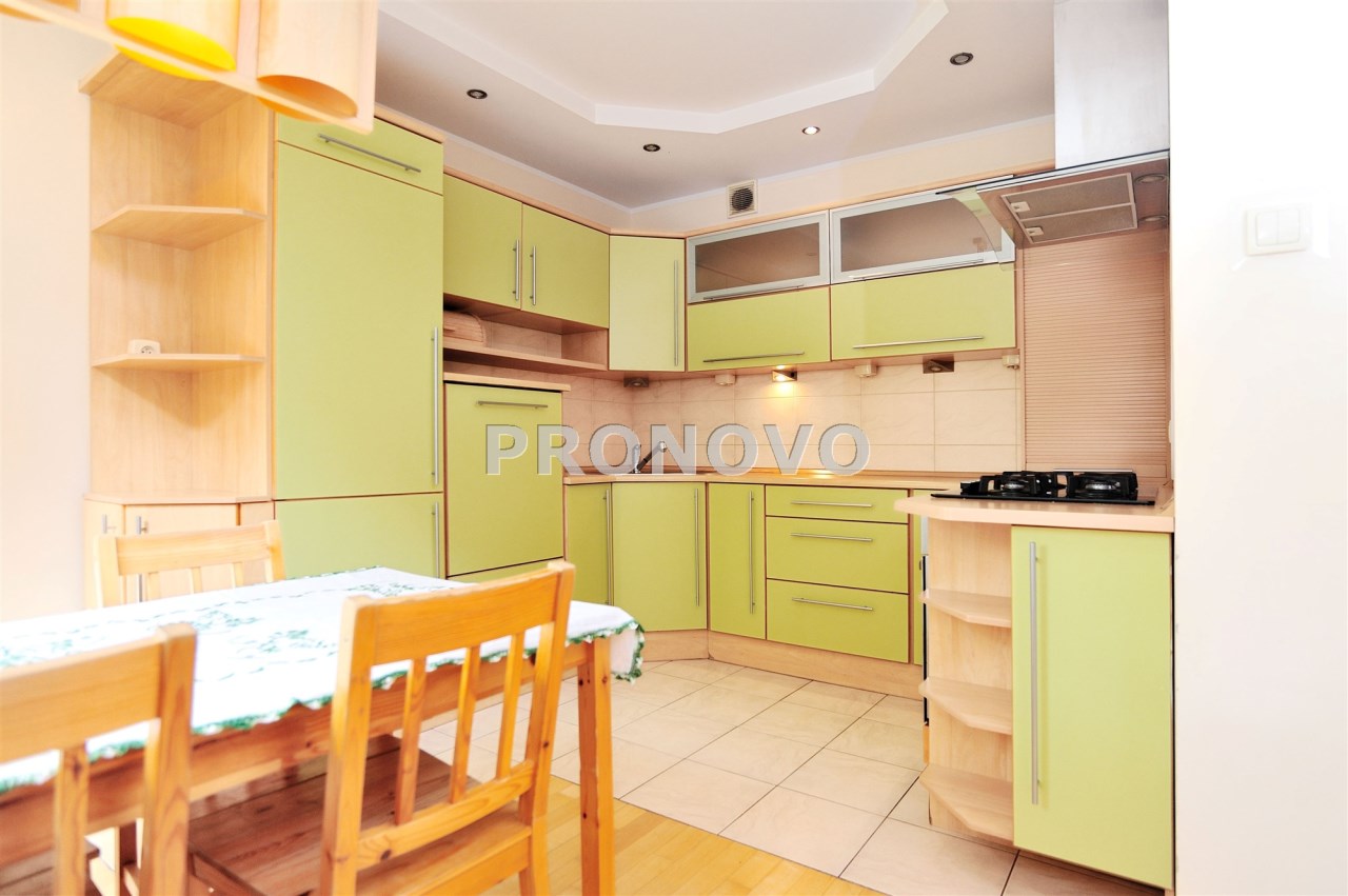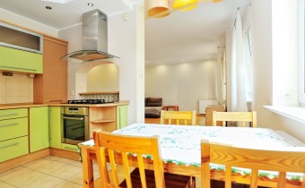 - Kuchnia (12m2) od strony południowej: Nowoczesne meble kuchenne w zabudowie w kolorze jesionowym i jasno zielonym. Duża lodówka z zamrażarką Electrolux w zabudowie, Zmywarka Siemens w zabudowie, kuchenka gazowa z płytą szklaną Whirlpool, piekarnik elektryczny Whirlpool. W kuchni duży stół na 6 osób.