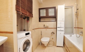 - Łazienka (5m2): wanna z zabudową szklano-aluminiową umożliwiającą jednoczesne korzystanie z prysznica, deszczownica HansGrohe. Pralka automatyczna. Umywalka z lustrem i szafką podumywalkową. WC kompaktowe z prysznicem bidetowym.