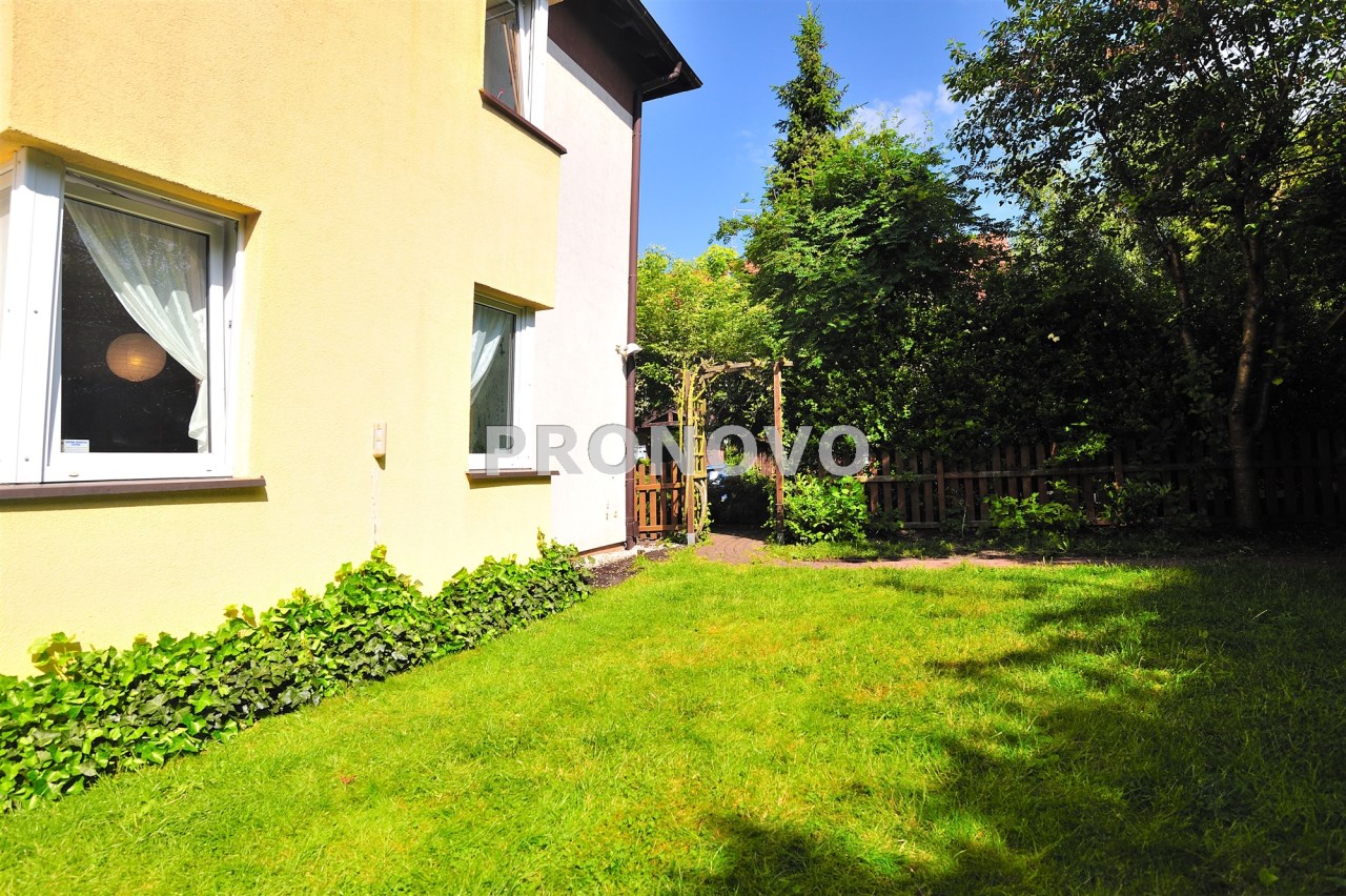 Trawnik, huśtawki dla 2x dzieci, liczne nasadzenia roślin, krzewy i drzewa owocowe, żywopłot, mini ogródek warzywny. Całość w pełni zagospodarowane. Ponadto w ogrodzie drewutnia z oświetleniem z przeznaczeniem na rowery, kosiarkę do trawy i grilla.