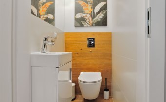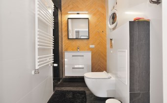 Salon dzienny z aneksem kuchennym, 3 sypialnie, hol, łazienka z kabiną prysznicową oraz toaleta.